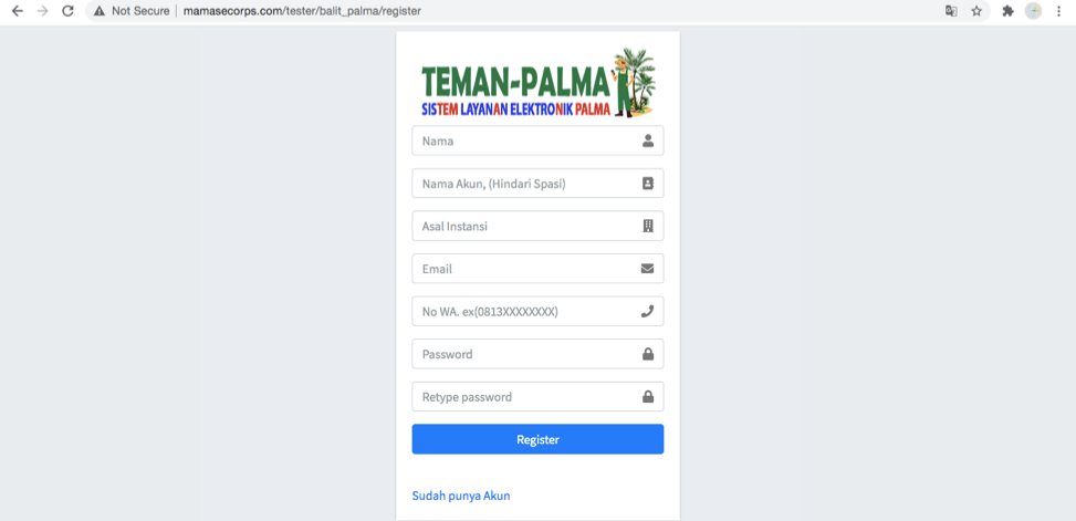Halaman ini berisi form awal yang harus di isi oleh stakeholder untuk mendaftarkan akun pada Sistem Layanan Elektronik Palma (Teman – Palma). Form ini terdiri dari beberapa inputan yang harus di isi yaitu :