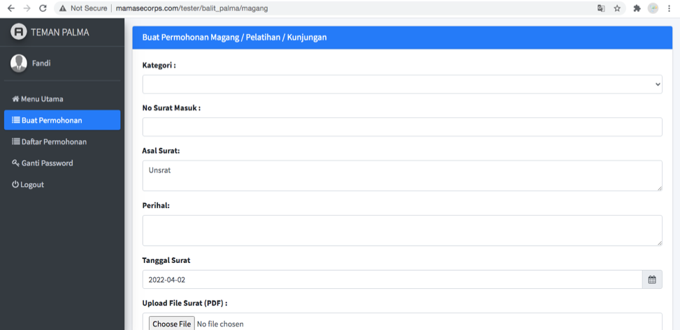 Halaman ini merupakan form permohonan yang akan di isi oleh stakeholder. Pada form ini terdapat beberapa input text dan input file yang harus di isi yaitu :